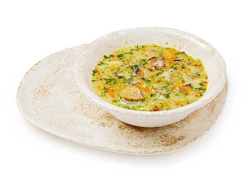 Шампиньоны, шпинат, лук, морковь, картофель, бульон куриный, сливки, укроп