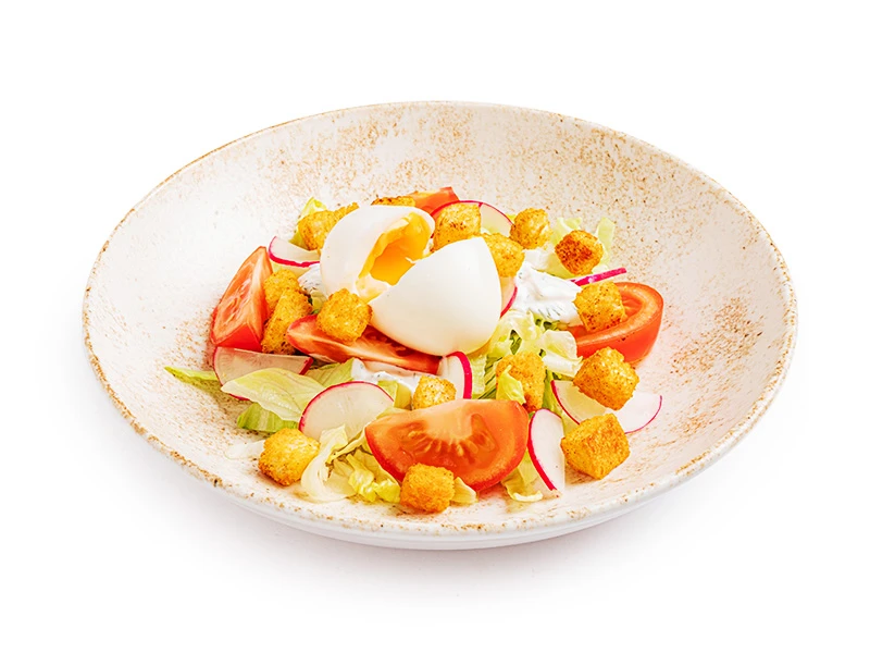 Яйцо, салат Айсберг, томат, редис, крутоны, сметана, чеснок, зелень