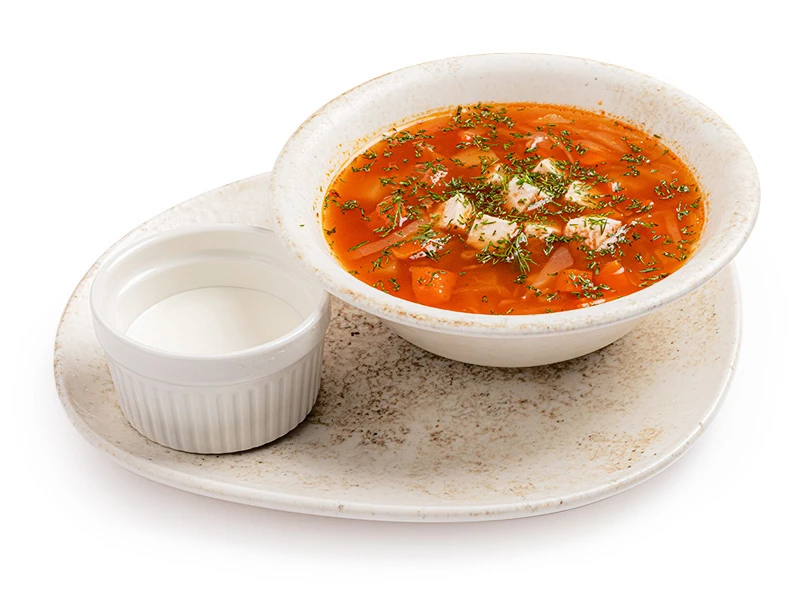 Капуста белокочанная, картофель, морковь, лук, паста томатная, филе куриное, сметана, укроп