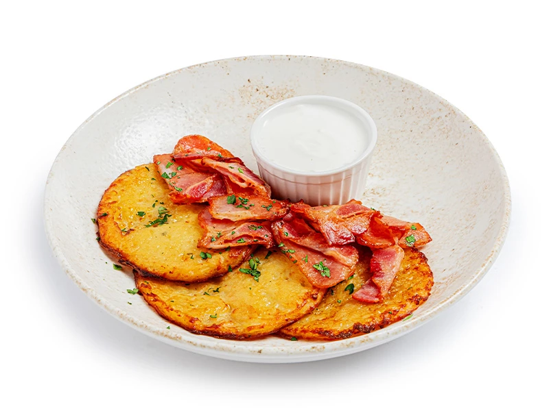 Картофельные драники, бекон, сметана, петрушка