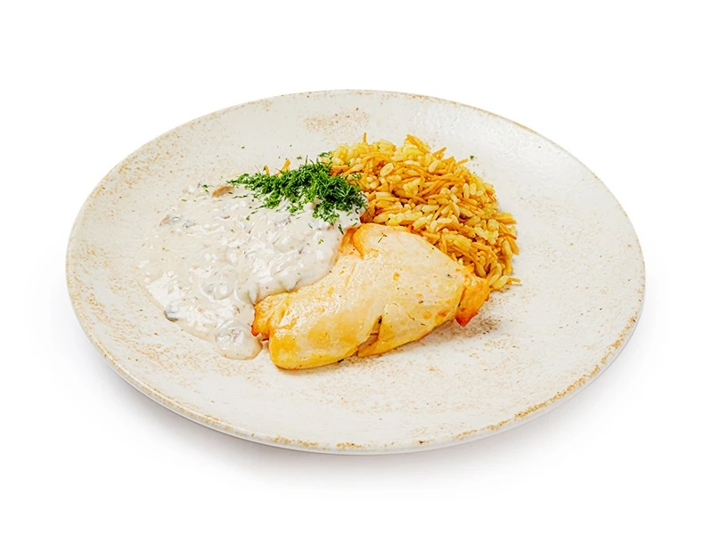 Куриное филе, сливочный соус из шампиньонов и лука, рис пилав, вермишель, зелень