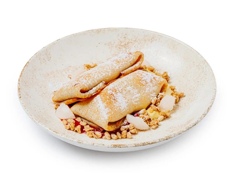 Блинчики с начинкой из творога и пюре манго, крем из творожного сыра и пюре манго, малиновое пюре, гранола, сахарная пудра