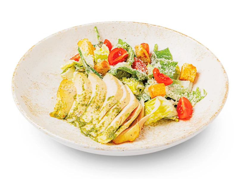Куриное филе, микс из салатов, томат черри, соус Цезарь, сыр Пармезан, гренки, масло базилик *содержит соевый соус, орех грецкий