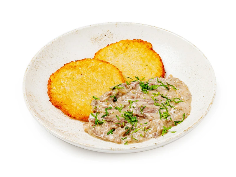 Картофельные драники, говядина, лук репчатый, шампиньоны, соус Бешамель, петрушка