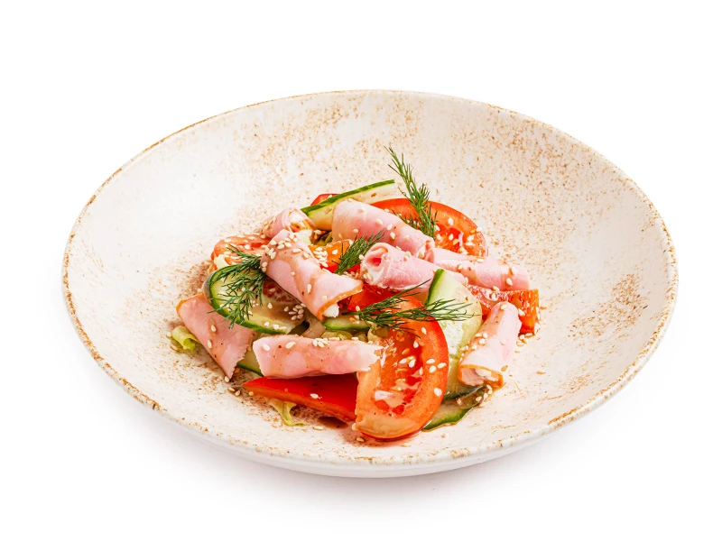 Салат Айсберг, огурец, томат, ветчина, перец сладкий, медово-горчичная заправка, сыр сливочный, кунжут, зелень