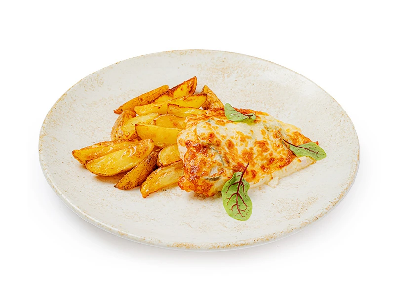 Свинина под сыром с маринованным огурцом с выбором гарнира