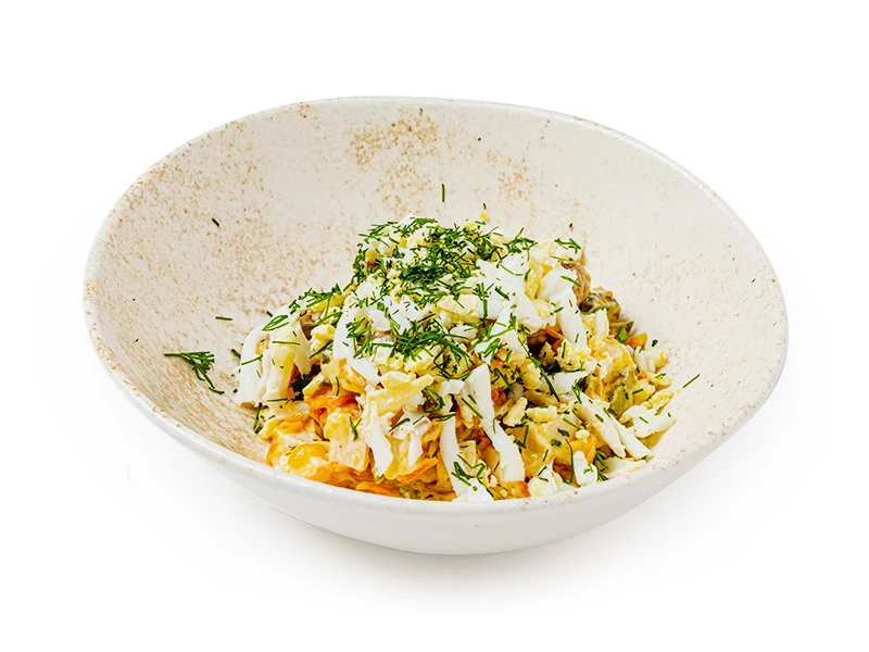 Филе куриное, огурец маринованный, лук, морковь, шампиньоны, майонез, яйцо, укроп