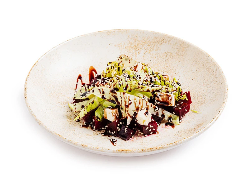 Свекла печеная, сыр Фета, салат Айсберг, крем бальзамик, кунжут белый