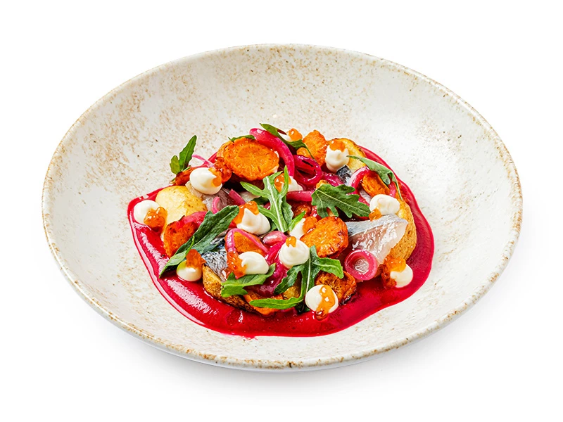 Сельдь на подушке из свекольного крема с добавлением чеснока и творожного сыра. Сверху - румяные картофельные дольки, запеченные с розмариновым маслом и ароматной приправой, сладкая печеная морковь, маринованный красный лук в малиновом пюре. Завершаем блюдо классическим майонезом, пикантной руколой и красной икрой.