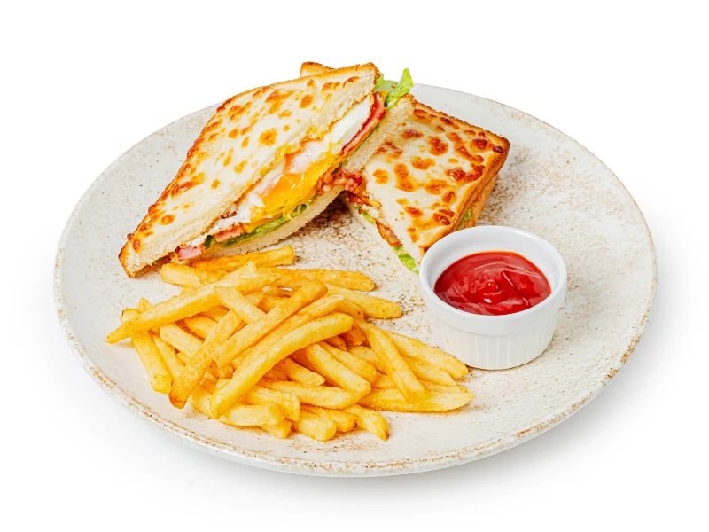 Хлеб сандвичный, майонез, яйцо, грудинка, сыр Чеддер, салат Айсберг, сыр Моцарелла, картофель фри, кетчуп